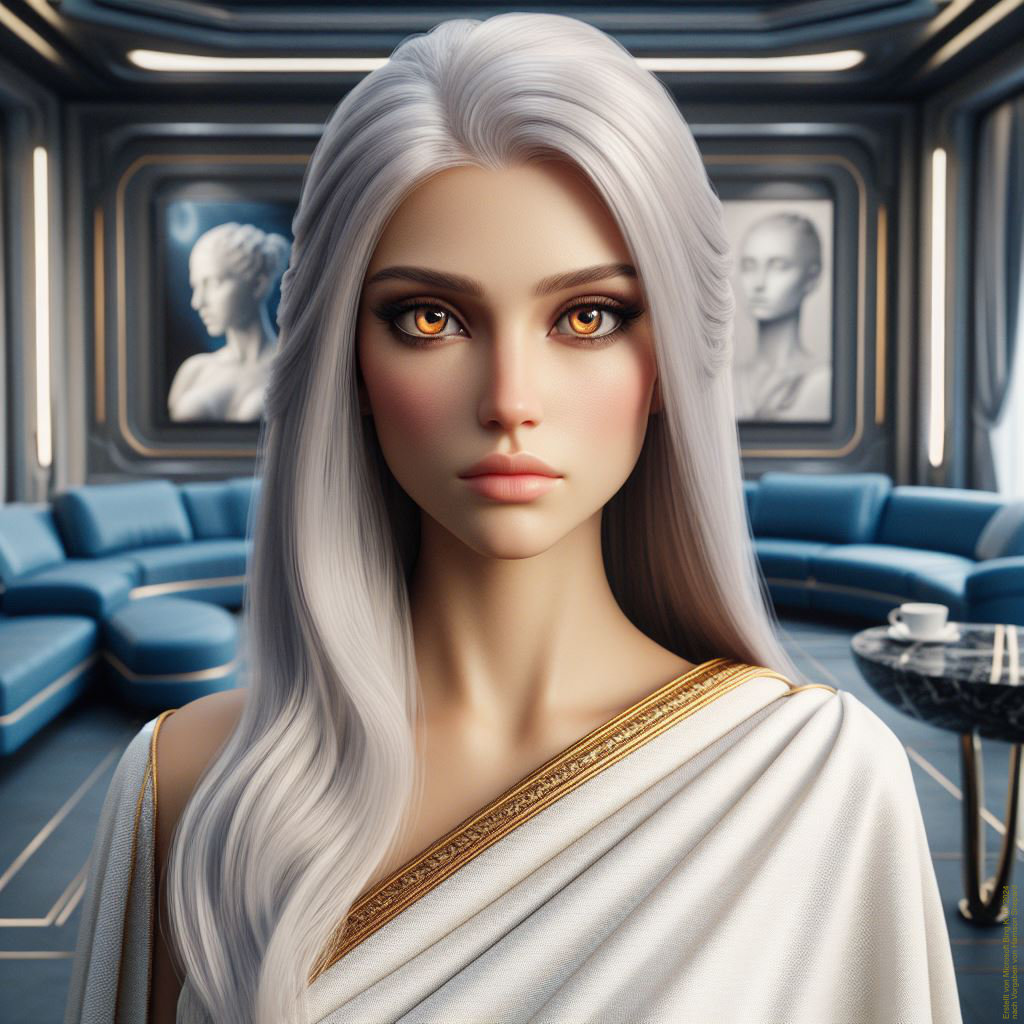 Es verging kaum eine Minute, da öffnete sich zischend die Tür der Robotküche. Eine junge Myrthonin mit langen silberweißen Haaren, einem edlen Gesicht und einer sehenswerten Figur trat hervor. Gekleidet war sie in ein eng anliegendes silberfarbenes Wickelkleid. Sie balancierte mit unnachahmlicher Eleganz ein Tablett zu ihrem Tisch.