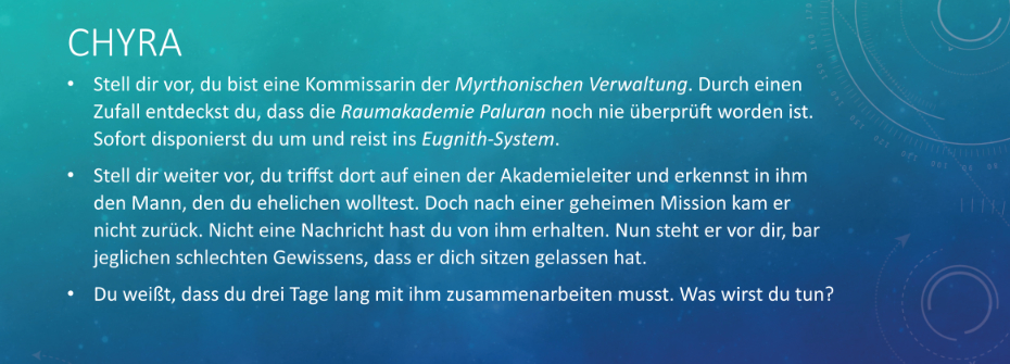 Innerhalb eines Augenblicks wurde das Bild erschreckend klar. Es schien in die Zentrale hineinzuspringen. Das Gesicht einer Kernweltmyrthonin, einer Höchst-Erleuchteten, einer Sternenfürstin wurde dargestellt. Sie mochte noch jung an Lichtzyklen sein. Aber sie trug die metallisch wirkenden silberweißen Haare hochgesteckt. Nach der aktuellen Mode ließ das darauf schließen, dass sie entweder einen hohen Rang in ihrem Haus innehatte oder einen entsprechenden Posten im myrthonischen Umfeld bekleidete. Sie strahlte Würde aus … Schönheit … aber auch Kälte. Doch das war nicht das, was Tranthar erschreckte. Es waren nicht ihre mandelförmigen Augen, sondern vielmehr das, was sie mit ihren Blicken versprühten. Ebenso war es das leichte Zucken, der mit langen Wimpern besetzten Augenlider, das Hervortreten der wohlgeformten Kinnpartie oder die fein geschwungenen Lippen, die etwas verkniffen wirkten.