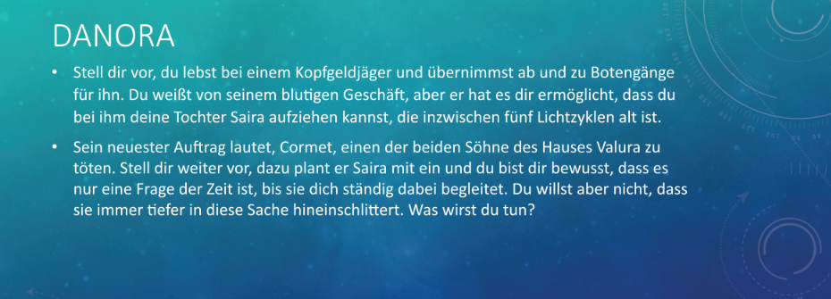 Sie hat eine fünf Lichtzyklen alte Tochter und macht Gelegenheitsgänge für Loryk, einem Kopfgeldjäger und Attentäter. Dieser half ihr einst, dass sie ihr Kind gebären und aufziehen konnte. So dient sie ihm aus Dankbarkeit.