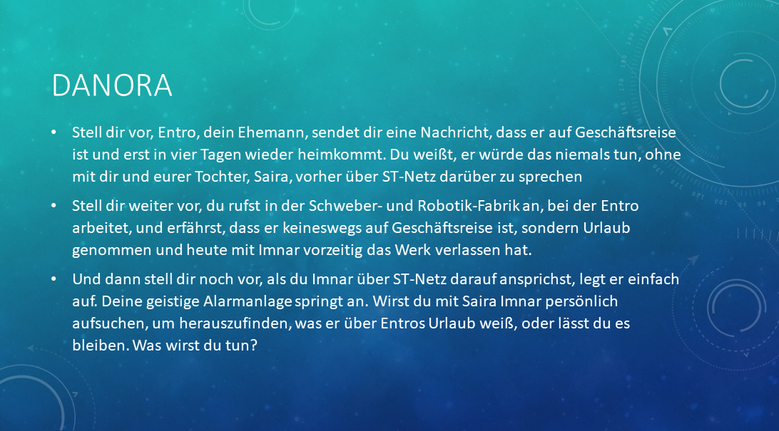 Danora schwanden fast die Sinne. Sie hatte einiges erwartet, aber nicht, dass sie von Entro belogen wurde. Sie spürte, wie sich ihre Kiefer verkrampften. »Sondern?«, presste sie mehr hervor, als dass sie es deutlich aussprach.