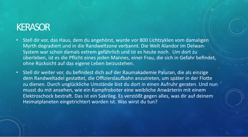 Er ist Kadettanwärter auf der Raumakademie Paluran. Sein Haus wurde vor über 800 Lichtzyklen auf den Planeten Alandor verbannt. Das ist eine gefährliche Welt. Als gesellschaftlicher Grundpfeiler gilt dort, dass jeder Mann verpflichtet ist, das Leben nicht nur der Frauen seiner Familie zu schützen, sondern das aller Frauen, soweit er die Möglichkeit hat einzugreifen.