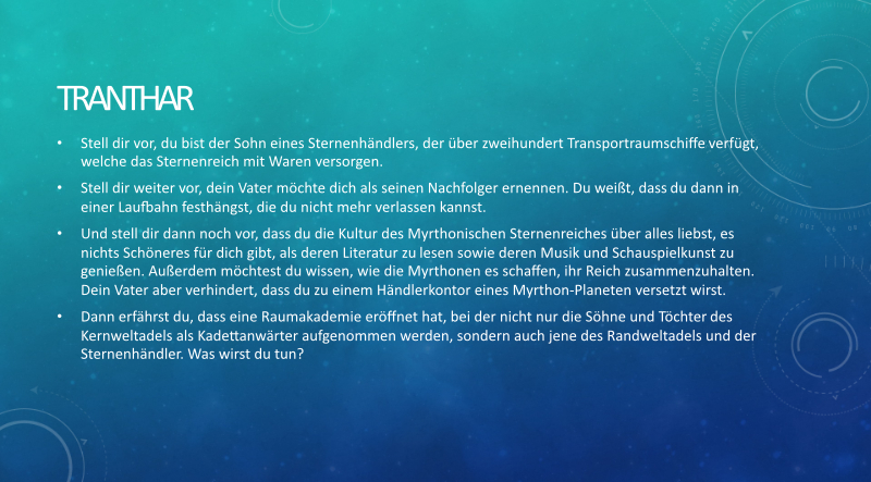 Tranthar ist ein Sternenhändler und den Prinzipien der Gilde verpflichtet. Doch schon bald bemerkt er, dass ihm große Meister der myrthonischen Musik mehr geben, als er entgegennehmen darf. Er beginnt ihre Werke zu lieben. Sein Interesse wächst. Es umfasst schließlich die gesamte Kultur, vor allem aber die Literatur. In ihm reift die Absicht, alles über das Sternenreich zu erfahren. Es reicht ihm nicht, nur mit den Adligen Verhandlungen zu führen. Er will wissen, wie die Myrthonen in den hohen Häusern leben, wie sie das Reich zusammenhalten. Er ergreift die Chance, als er von der neu gegründeten Raumakademie Paluran hört, die auch Sternenhändler als Kadetten aufnehmen. Nun ist er dort Kadettenanwärter und muss sich dem Nachwuchs von Adelsfamilien stellen, die dort ebenfalls geschult werden.